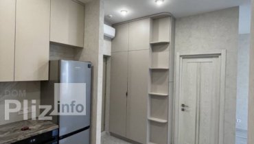 Квартира с балконом для летних вечеров. Квартира спланирована с акцентом на общую комнату с выделеной зоной кухни, установлена невысокая перегородка. Спальня - отдельное небольшое помещение со стеклянными перег...