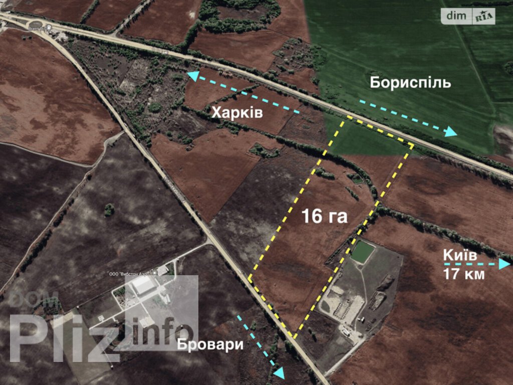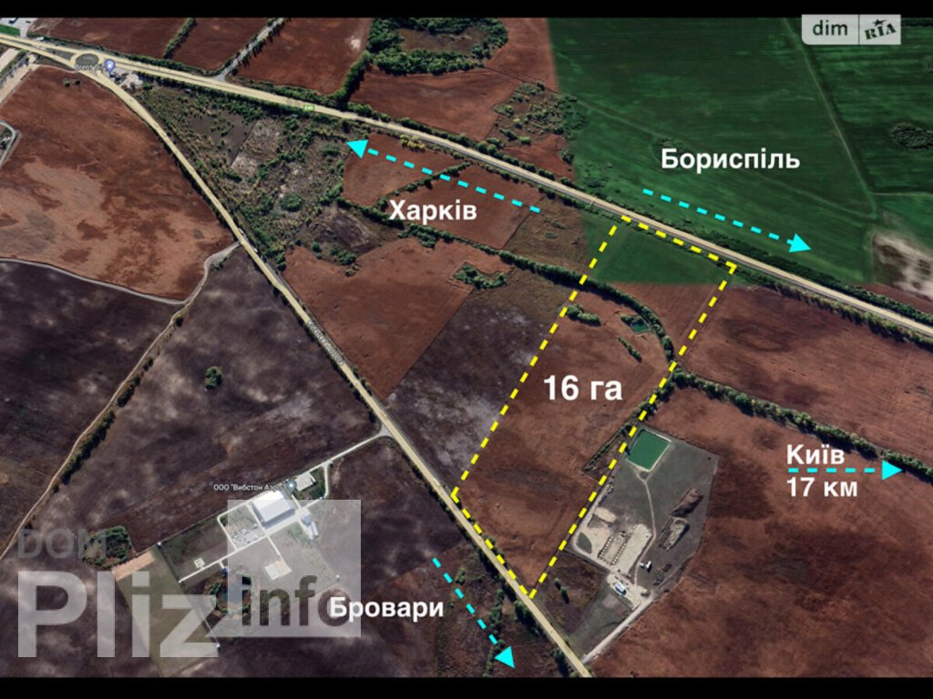 Продається фасадна ділянка площею 16 га на трасі КиївХарків та Бориспільсько-Броварській окружній дорозі Земельна ділянка розташована за адресою: Київська область, Бориспільський район, Іванківська с/р. Основні переваги: - Зручне розташування: 16 км до Києва, 10 км до міжнародного аеропорту «Бориспіль» - Фасадний вихід на трасу Київ Харків (М-03) та Бориспільсько-Броварську окружну дорогу (Р-03) Характеристика земельної ділянки: - Площа: 16 га - Право землекористування: приватна власність - Геометрична форма: правильний прямокутник - Рельєф: рівний - Грунти: переважно чорнозем та піщаний грунт - Артезіанська свердловина / пожежний водойм - Поруч проходять ЛЕП 35 кВ та 10 кВ Цільове призначення: - 11.02 Для розміщення та експлуатації основних, підсобних та допоміжних будівель і споруд підприємств переробної, машинобудівної та іншої промисловості, землі оптової торгівлі та складського господарства Ідеально підходить для будівництва промислових обєктів, складських комплексів або підприємств оптової торгівлі.