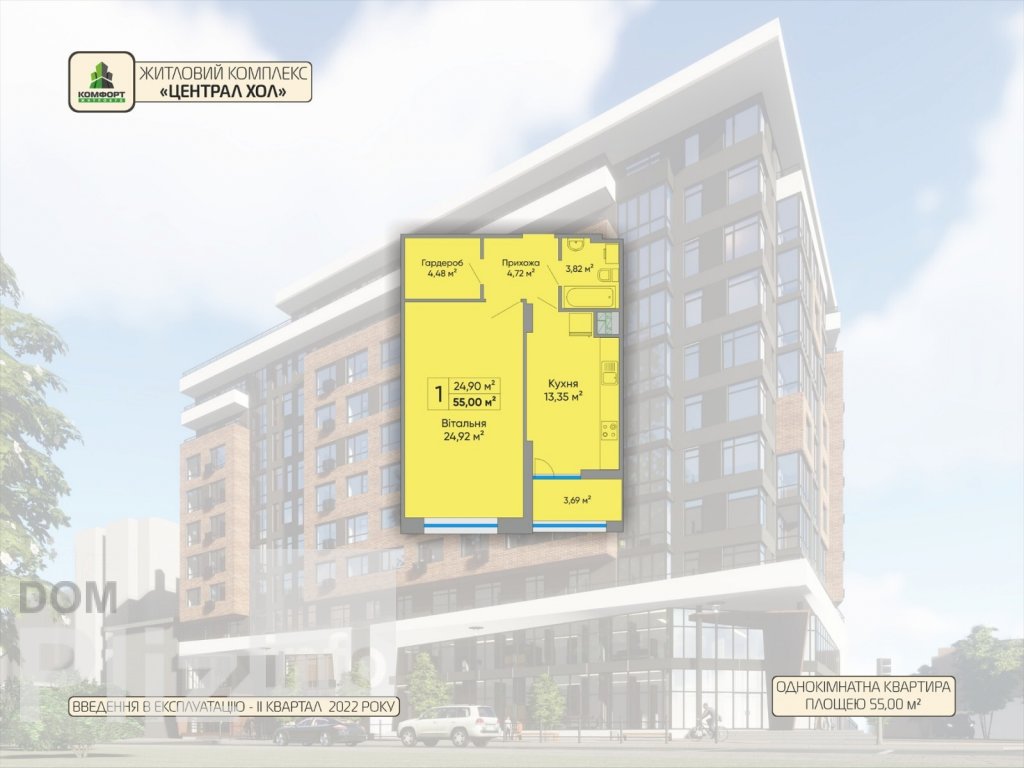 Продається простора однокімнатна квартира в центрі міста. Квартира розташована на 4 поверсі. Загальна площа 55,3 кв.м, функціональне планування: велика окрема кімната, яку можна зонувати, простора кухня, суміжний санвузол. Квартира сира, стан після забудовника. Квартира розташована у новому житловому комплексі. Двір закритого типу, в пішій ходьбі центр міста, школи та садочки, автовокзал та ринок. У перших двох та частині цокольного поверху розміщуватимуться комерційні приміщення.