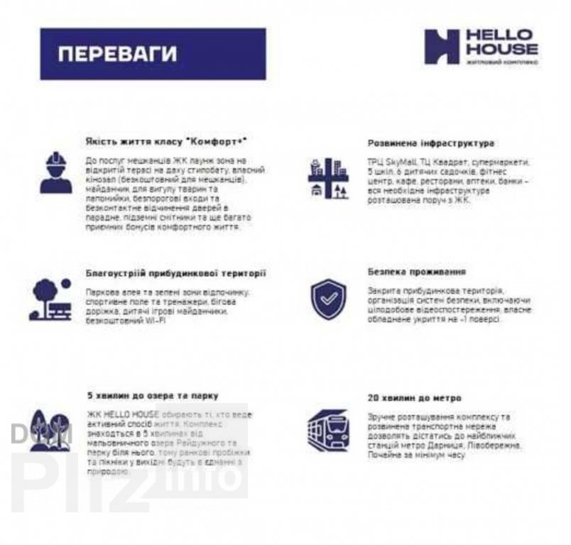 Пропонується до продажу квартири в ЖК Hello House, вул. М.Кібальчича 1. Просторі квартири площею від 28,55 кв. до 59,04 кв. Відмінний варіант для першого житла або інвестування коштів. Сучасне житло класу Комфорт + за доступною ціною в Дніпровському районі міста Києва. смарт квартири від 28,55 кв. до 31,21 кв. 1-кім.кв. від 36,28 кв. до 53,62 кв.м., 2-кім.кв. від 51,32 кв. до 59,58 кв. - панорамні вікна, міжквартирні перегородки з керамоблоку, фасад, що утеплює; - власна котельня, що забезпечує автономне опалення; - закрита прибудинкова територія із сучасним дитячим майданчиком та лаунж-зоною на відкритій терасі кафе; - зелені зони відпочинку, спортивне поле; - підземний та гостьовий паркінг для надійного зберігання свого транспортного засобу -резервне живлення -бомбосховище, у вигляді домашнього кінотеатру Зручне розташування комплексу та розвинена транспортна мережа дозволяють дістатися до найближчих станцій метро Дарниця за 10 хв, Почайна - 15 хв, Лівобережна та Чернігівська - 20 хв та на Правий берег столиці за 10 хв. Комплекс має власні торгові та офісні приміщення, крім того, в пішій доступності знаходяться торгові центри КВАДРАТ та Sky Mall, супермаркети NOVUS, ФОРА, фітнес-центри, басейни, медичні центри, кінотеатр. Поруч із комплексом знаходяться 5 шкіл, серед яких школи з поглибленим вивченням економіки та права та поглибленим вивченням англійської мови, 6 закладів дошкільної освіти, Дитяча музична школа №13 імені М.Глінки, Станція юних техніків – Центр науково-технічної творчості молоді. Комплекс знаходиться за 5 хв ходьби від одного з найбільших та найчистіших київських озер – озера Райдунка ( пляжні зони, прокат човнів, сучасні дитячі майданчики), Парку Перемоги (20 хв) для активного відпочинку на природі. Діють гнучкі умови придбання квартир: знижки, акції, розстрочка. Встигни купити за вигідною ціною. Є відеоогляд на кожне планування, пиши чи дзвони, записуйся на перегляд.