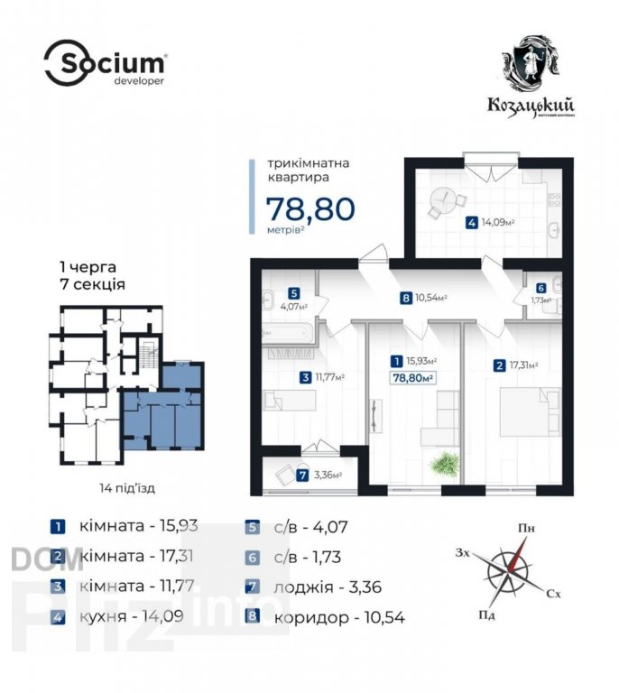 Продається 3к квартира по вулиці Довженка в ЖК Козацький від якісного забудовника Socium Developer Котел зі встановленням у подарунок. Можна робити ремонт. Усі роботи виконано, активно робиться прибудинкова територія. Здача квартири до кінця зими! Всі кімнати з панорамними вікнами. Велика кухня 14,09м2 з балконом. Спальня з лоджією. Площа квартири 78,8м2; Поверх 8 з 9. Житловий комплекс знаходиться в мікрорайоні Бам, де поруч все необхідне в пішій доступності. ЖК закритого типу з відеонаглядом, власною інфраструктурою, дитячими майданчиками. • технологія будівництва – цегляна; • енергозберігаючi панорамні вікна з шестикамерним профілем та мультифункцiональним склопакетом товщиною 42 мм європейського стандарту; • зовнішне утеплення 10 – сантиметровим пінопластом; • додатковий шар шумоізоляції міжквартирних стін; • просторі лiфти з внутрішнім індивідуальним дизайном виробника ТМ LIFTPORTAL; • Декоративне оздоблення підїздів : нержавіючі поручні на сходових маршах; • передбачені лічильники газу, електроенергії та води • штукатурення внутрішніх цегляних стін під рівень; • чистова стяжка; • вхідні двері від надiйного українського виробника. Висота стелі 2,7м.