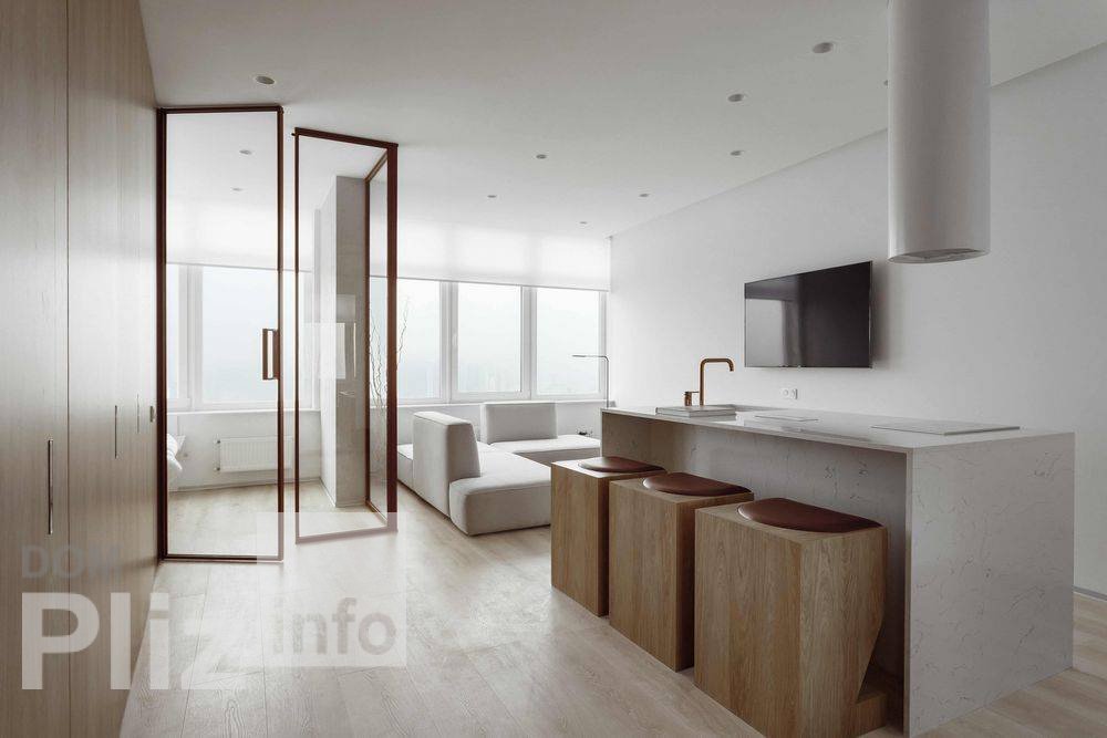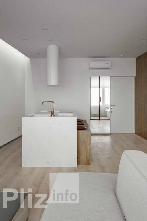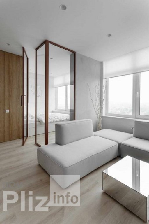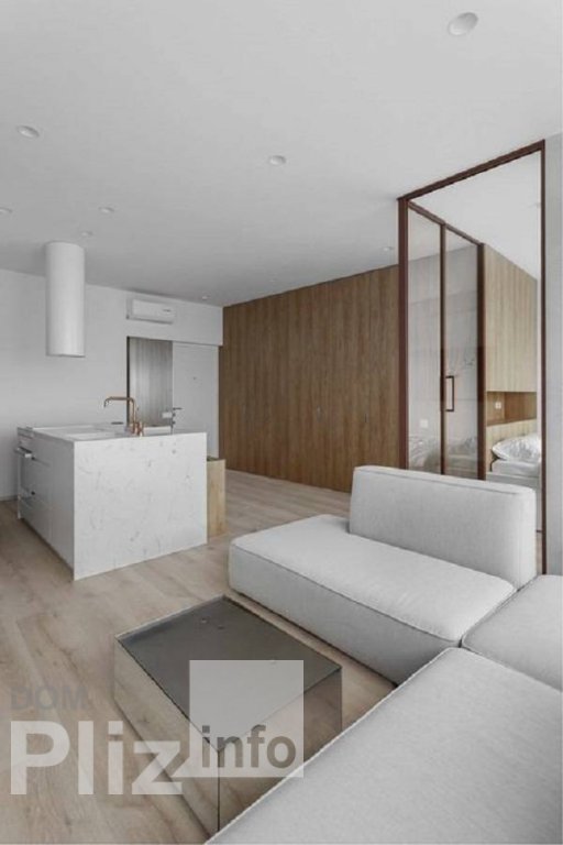 Квартира с балконом для летних вечеров. Квартира спланирована с акцентом на общую комнату с выделеной зоной кухни, установлена невысокая перегородка. Спальня - отдельное небольшое помещение со стеклянными перег...