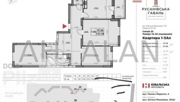 Продажа трехкомнатной квартиры по улице Евгения Маланюка, 101 («ЖК Русановская Гавань») Днепровский район . Секция 22. Этаж 18/26. Площадь 117/58/17.2 м2. Двухсторонняя планировка: три отдельных жилых комнаты, ...