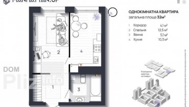1 кімната · 4 поверх з 14 Загальна площа 44 м #178; Стіни з цегли...
