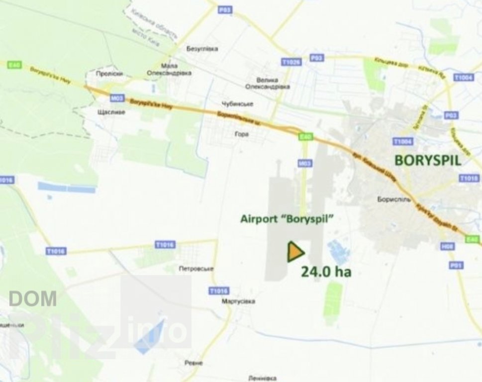 Продаж земельної ділянки яка прилягає до міжнародного аеропорту «Бориспіль». Загальна площа земельної ділянки 24 Га Цільове призначення: для розміщення торгівельно-офісно, складських приміщень. Розроблений проект по будівництво складського комплексу. Також є дозвіл від украаеропроект з певними вимогами на будівництво.