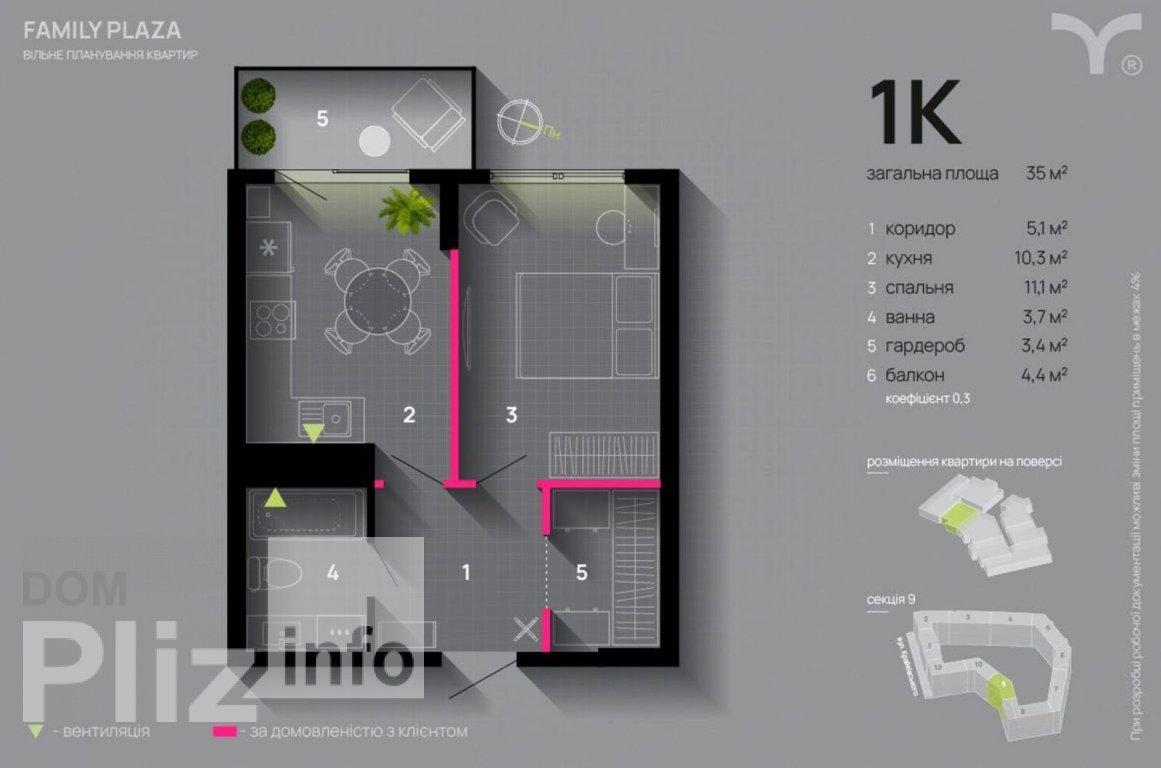 Продам 1 - кім квартиру ( 9секція, 35 м2 ) в ЖК Family Plaza / Фемелі Плаза/ Фемілі Плаза від компанії Blago. #8232; Комплекс знаходиться неподалік від центру міста. Також вся необхідна інфраструктура (магазини, пошта, парк) в межах пішої доступності, тобто 10 - 15 хвилин пішки: - Нова Пошта — 10 хвилин пішки #8232; - Сільпо — 15 хвилин пішки #8232; - Міська Ратуша, тобто центр міста — усього 20 хвилин від дому #8232;Основними чинниками, які відрізняють цей комплекс від інших новобудов: • Закритий від авто двір #8232; • Декілька дитячих майданчиків прямо на території комплексу • Енергоефективний фасад • Вікна в “підлогу” в кімнаті з балконом #8232; • Підземний Паркінг для Авто #8232; • Кімнати для зберігання візочків