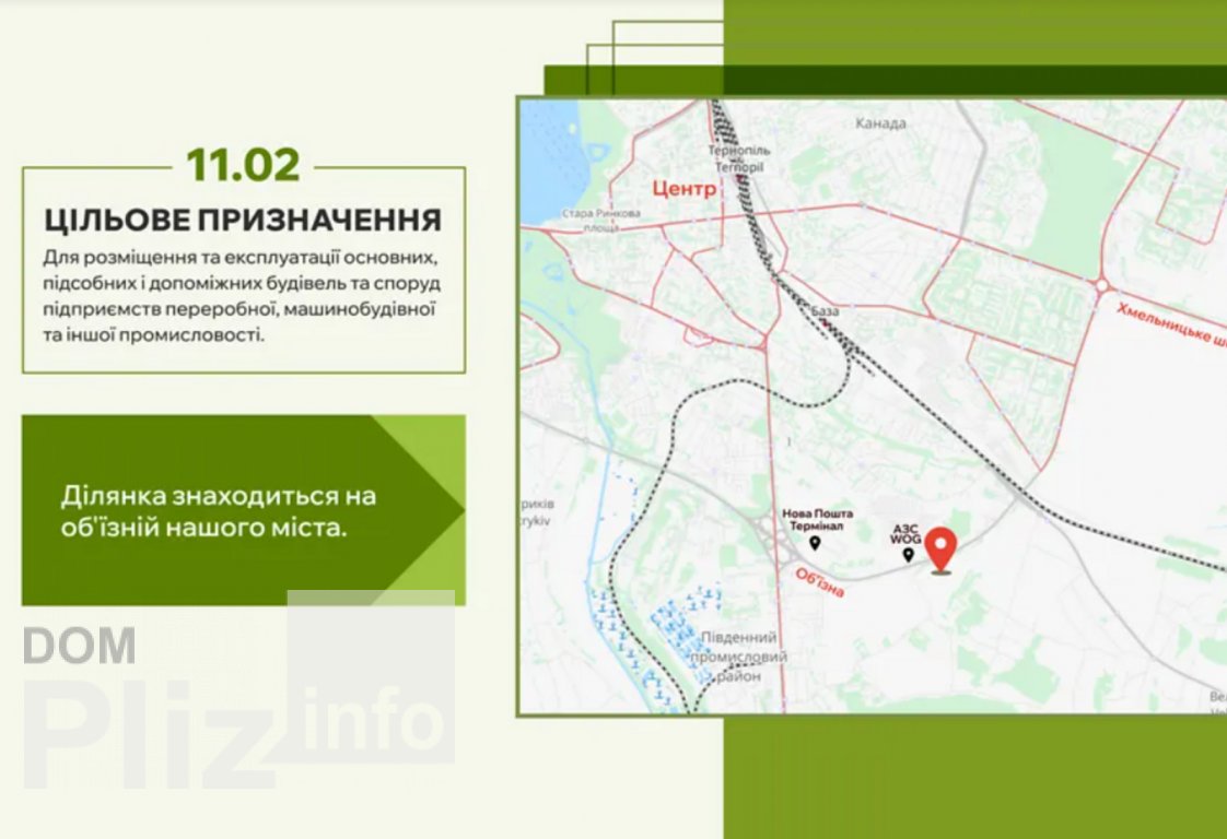 Пропонуємо у власність земельну ділянку загальною площею 5,7 га в місті Тернопіль по вулиці Об #700;їздна. Цільове призначення ділянки (код 11.02) дозволяє використання для розміщення та експлуатації будівель і споруд підприємств у різних промислових сферах. Об #700;їздна міста, фасадна ділянка, вигідна локація для створення складських, промислових, виставкових об #700;єктів. Ділянка розташована з низкою важливих інфраструктурних об #700;єктів поблизу: - Зручна транспортна розвязка — Траса міжнародного значення - Зупинка громадського транспорту — Розташування у місті