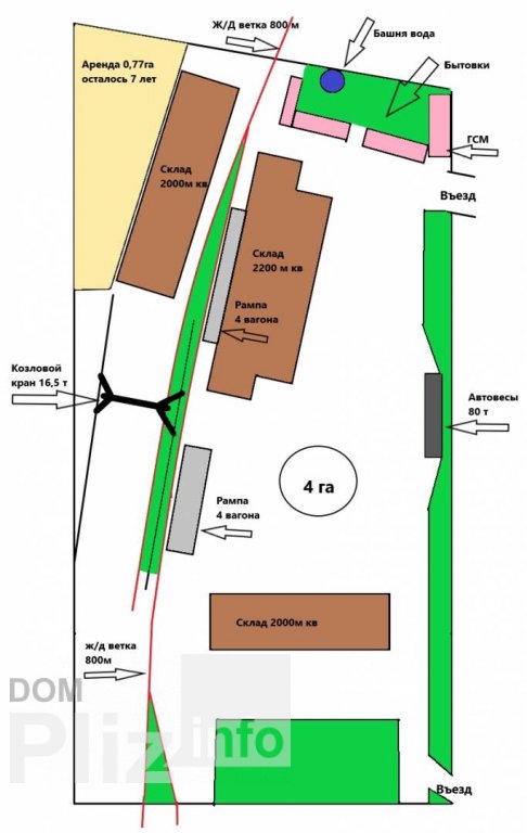 Земельный участок 6,0 Га. На территории расположено 3 склада общей площадью - 6200м2. 2 железнодорожные ветки - 1050м. 2 рампы (ЖД/авто). Автовесы (80т). Козловой кран (16,5т.). 3 гаража (ремзона). 4-бытовки (по типу - вагончиков). Склад ГСМ (16 куб.). Водонапорная башня (10 куб). Тепловоз ТГМ 23-Б. Офис, жилой 2-х этажный дом, подсобное хозяйство, крытая стоянка на 8-авто. Посредникам, просьба не беспокоить.