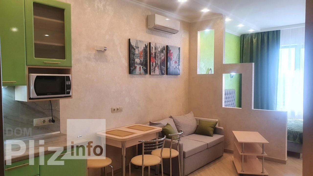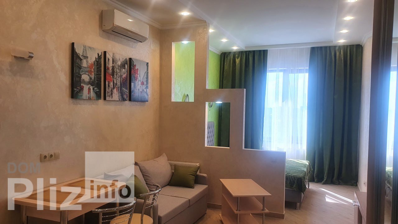 Сдам красивую 1-ком. квартиру-студию в жк Милос, расположенном в пер. Клубничном на 7-ст. Большого Фонтана. Квартира с евроремонтом, общ пл 35м, этаж 8/16, есть спальная зона с двуспальной кроватью и зона гостиной с раскладным диваном, большой ТВ с поворотом, встроенная кухня с хорошей плитой и духовкой, кондиционер, большой холодильник, с/у с душевой кабиной. Дом расположен недалеко от моря, Аркадии, рядом парк, магазины, в доме охрана, автономия и свет не отключают, квартира сдаётся на длительный срок без выселения на Лето, рассматривают с Ребёнком и небольшим Питомцем, аренда 14 000 грн/мес