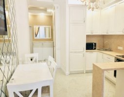 2-х комнатная квартира площадью 90 кв.м расположена на 4 этаже нового дома с лифтом. Выполнен новый ремонт, первая сдача. В квартире: кухня, гостиная комната, спальня, два санузла, гардероб, мебель ...